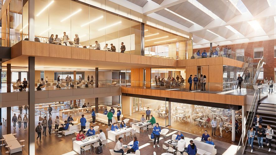 The goal of the Pratt School of Engineering’s vision for Hudson Hall was to position the facility as a vibrant student-focused center and modern research building that recognizes the building’s historic value to generations of engineering alumni and to the broader campus community while providing equitable, safe and flexible learning and research environments that promote curiosity and discovery. A building renewal designed by Ballinger and TenBerke encloses existing exterior courtyards to form a new multi-story, light-filled atrium embraced by the building’s historic brick wings. The 190,000 SF renovation and expansion will sensitively restore the 1948 building’s historic brick exterior while expanding teaching spaces and quadrupling the amount of student social space.