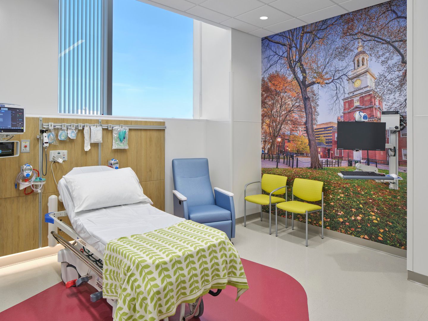 Expanding the focus beyond the individual patient to generating joy in the face of difficulty for the entire family, all patient rooms are single occupancy and include a family area complete with sleeping space and entertainment system. Toys are easily accessed by staff to provide patients with comfort and distraction. Each room has a convertible daybed for family members as well as a photo mural of Philadelphia landscapes, grounding patients with a sense of place while supplying nursing staff with guided imagery to calm patients during procedures. The lighting design serves as a similarly soothing distraction, utilizing dynamic LED troffers that mimic the effect of flowing water or rustling leaves.