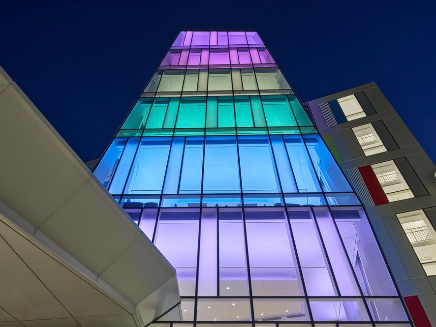 Affectionately referred to as “the beacon,” a single entrance designed as a towering glass trapezoid unites and visually demarcates the two buildings, new and old. Symbolically, it marks the hospital’s significance for children and their families; practically, it is the door to over 50 new inpatient beds and four state-of-the-art operating rooms equipped to provide advanced care in the community’s first around-the-clock emergency department exclusively for children.
