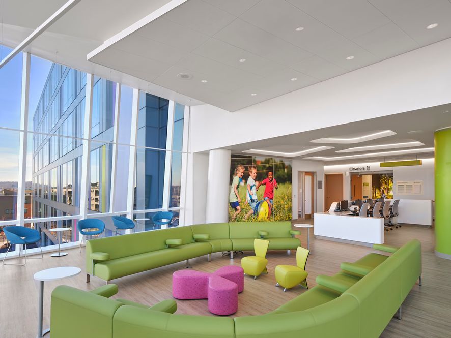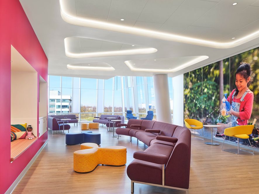 Public spaces throughout the hospital are signaled with colorful, rounded geometric shapes. Overhead, a recessed lighting feature that gently signals gathering points form “clouds” that illuminate and add dimension. Furniture continues this language at scales that engage both young patients and their families, introducing elements of play and exploration.