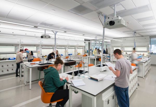 Ballinger provided those conditions by organizing the interior into research/teaching “neighborhoods.” A ground-floor publicly accessible commons features teaching labs and open work zones for capstone projects, signaling the dovetailing of disciplines as well as the integration of teaching and research.