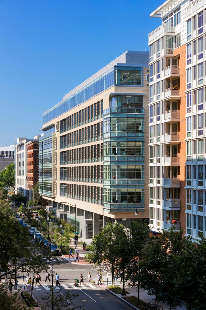 The scale of GW’s first major new laboratory building in 50 years was, at first glance, daunting on two levels: the size of the building – at 750,000 GSF it would span a city block – and the number of academic units it would house – nine in all. The challenges were daunting, too. The big building needed to feel small to its occupants, give them a sense of community, and give their disciplines a higher profile, on and off campus. The building had to put GW’s science and engineering on the map.