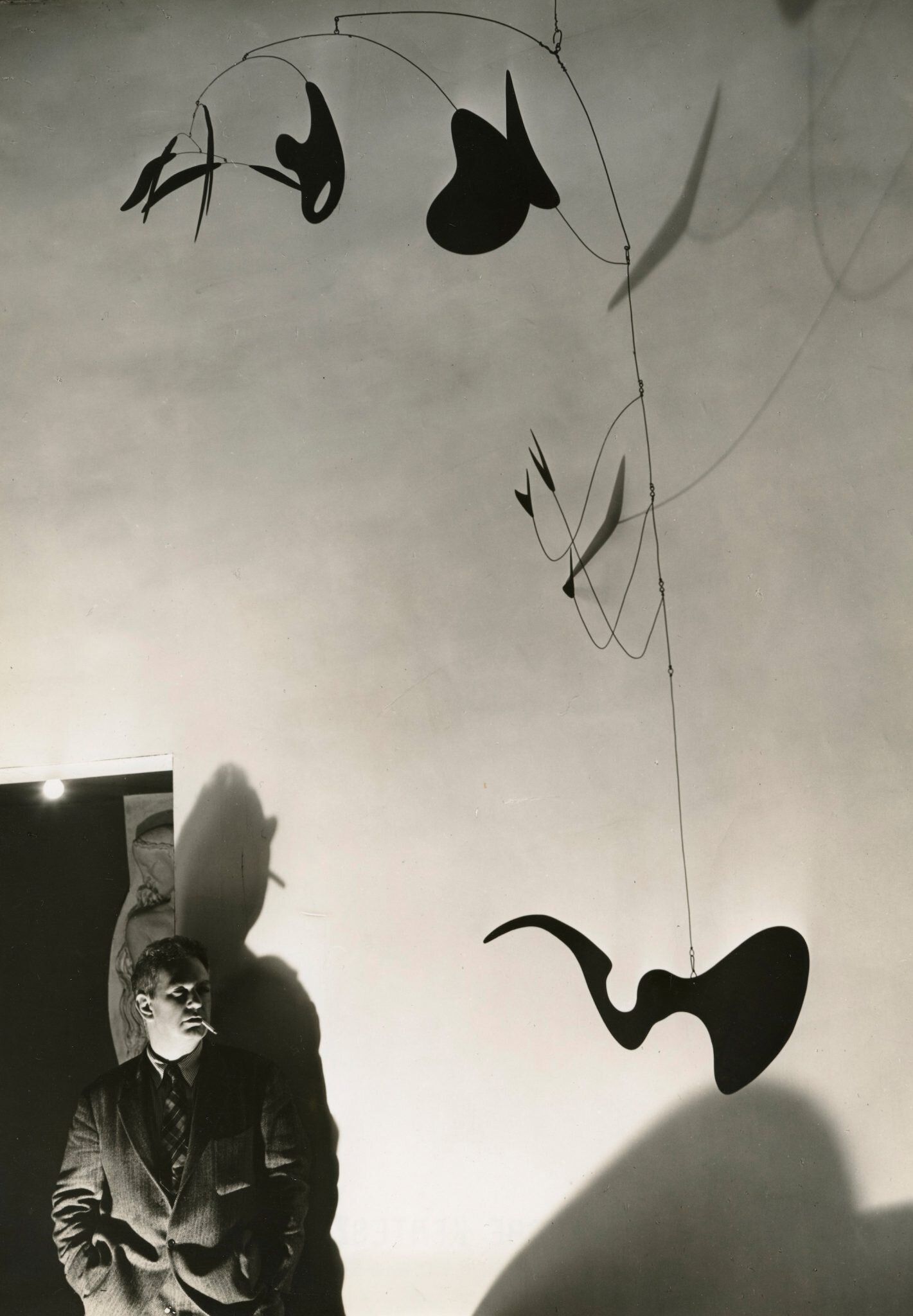 Alexander Calder in 1940 with his mobile “Eucalyptus,” which now hangs alone in a small gallery at the new Calder Gardens. The photograph is by André Kertész.Credit…Calder Foundation, New York/Artists Rights Society (ARS), New York via Ministère de la Culture/Médiathèque de Patrimoine, Dist. RMN-Grand Palais; Photo by André Kertész