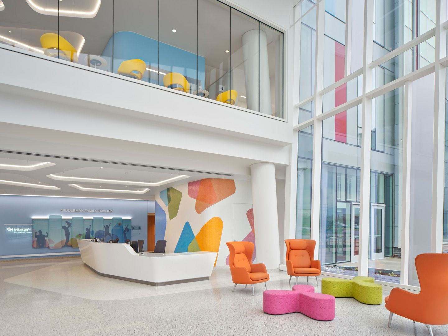 Public spaces throughout the hospital are signaled with colorful, rounded geometric shapes. Overhead, a recessed lighting feature that gently signals gathering points form “clouds” that illuminate and add dimension. Furniture continues this language at scales that engage both young patients and their families, introducing elements of play and exploration.