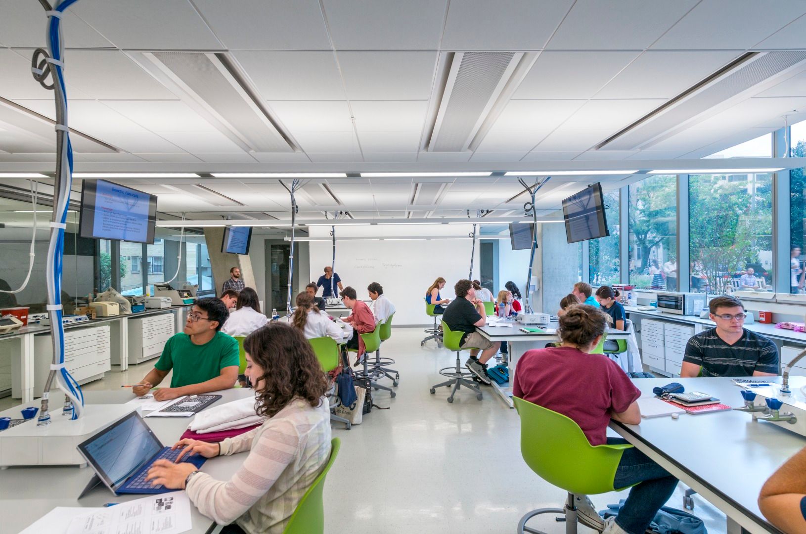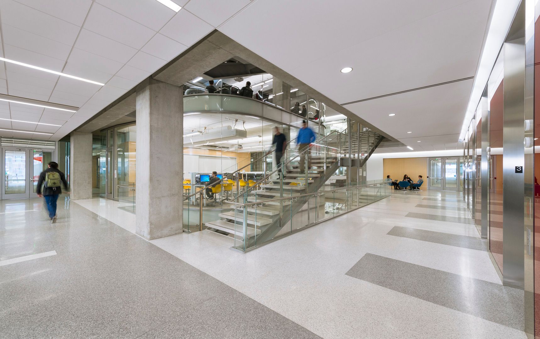 Ballinger provided those conditions by organizing the interior into research/teaching “neighborhoods.” A ground-floor publicly accessible commons features teaching labs and open work zones for capstone projects, signaling the dovetailing of disciplines as well as the integration of teaching and research.