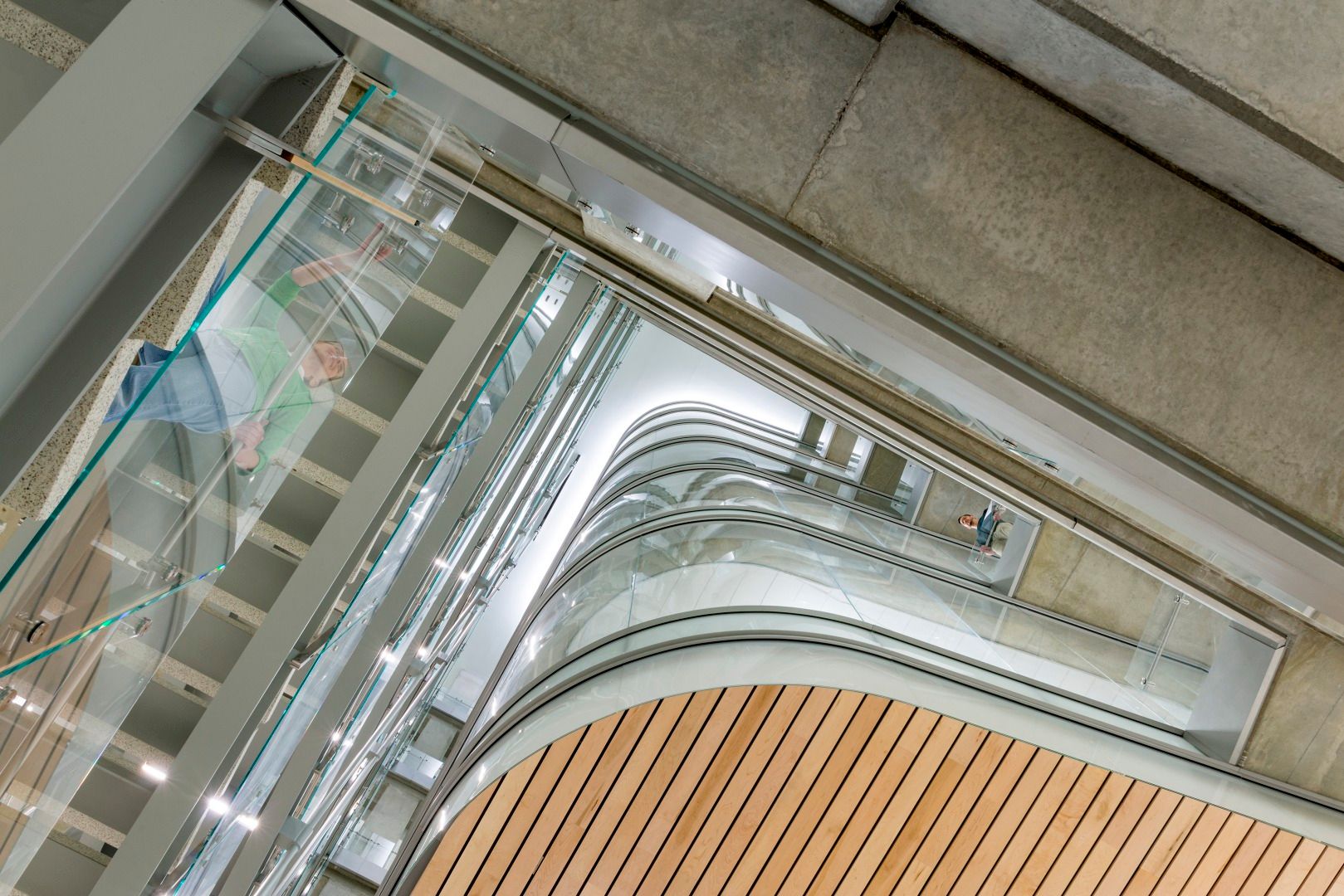That strategy continues into the 10-story tower, where different disciplines are integrated by clustering their labs and offices around common spaces called “collaboratoriums.” These unique spaces are visible to passersby outside and invigorating to those inside, providing tangible cohorts for people to feel part of.
