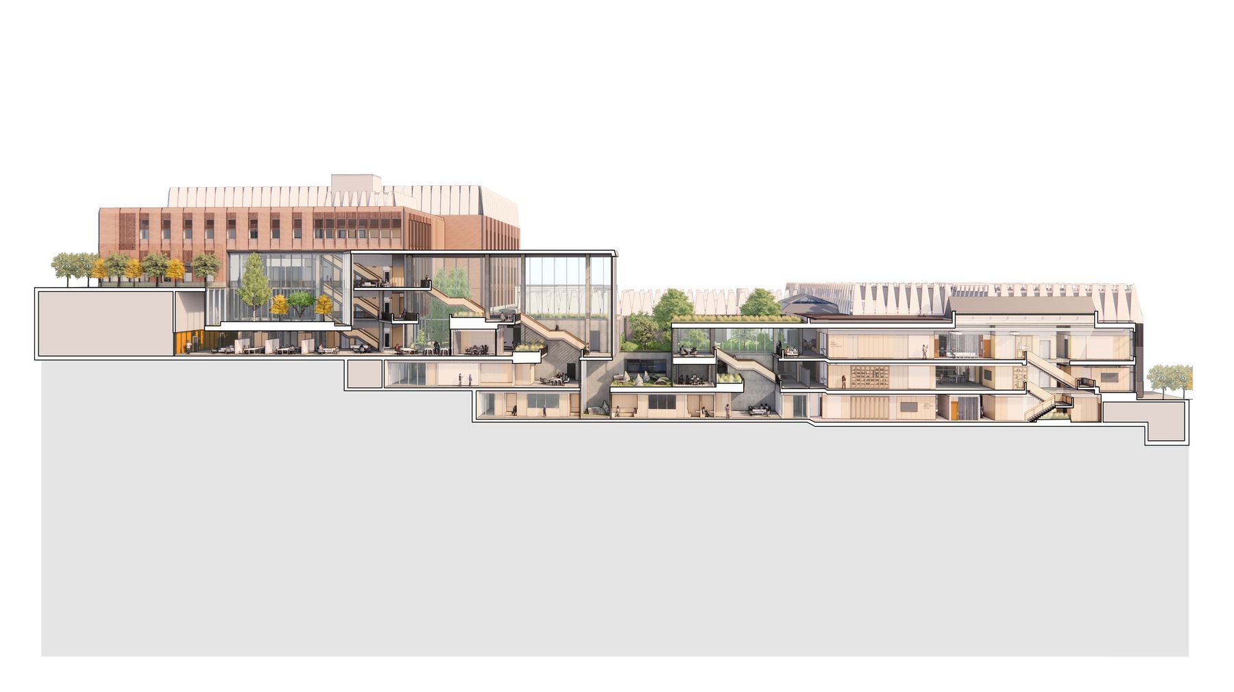 The building itself is a conceived of a network of overlapping hubs, organized by research initiatives rather than traditional departments. The project’s goal of shaping a new interdisciplinary community is realized through a “terraced street” that connects the vast complex. Though much of the building will be below-grade, the design brings daylight deep into the structure, with light and planted courts providing strategic landmarks and visibility outdoors.