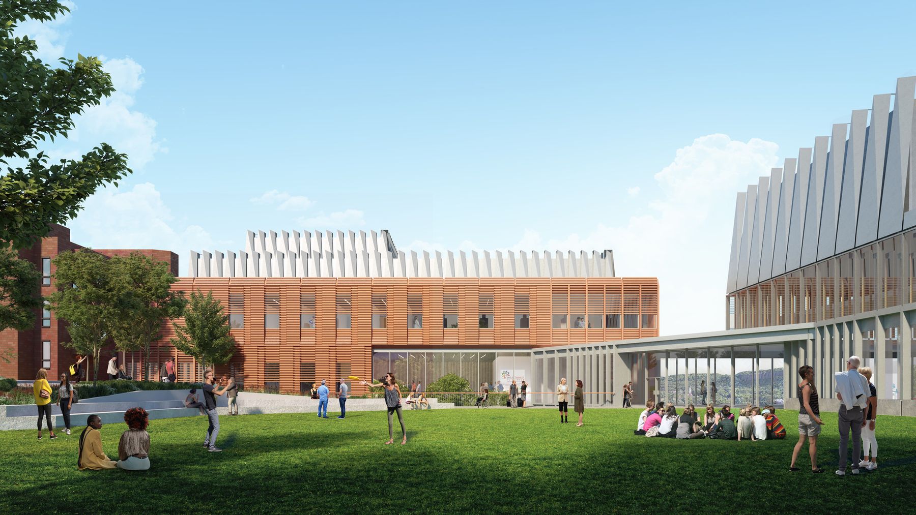 At the northern edge of Yale’s central campus, the project will transform Science Hill’s campus fabric into a welcoming, publicly accessible series of landscape spaces that restore circulation and movement for pedestrians and cyclists throughout the site—no simple task for a site that rises 50 feet from east to west. Vibration control is one of the primary design drivers for quantum science facilities, and Science Hill’s sloping site close to bedrock was chosen for its exceptional vibration stability. From the base of the hill, the USHD is conceived as a series of interconnected pavilions that climb upwards. Terracotta and glass facades will play off one another: transparency will allow in natural light and reveal the scientific activity within, balanced with masonry that is contextual to the campus.