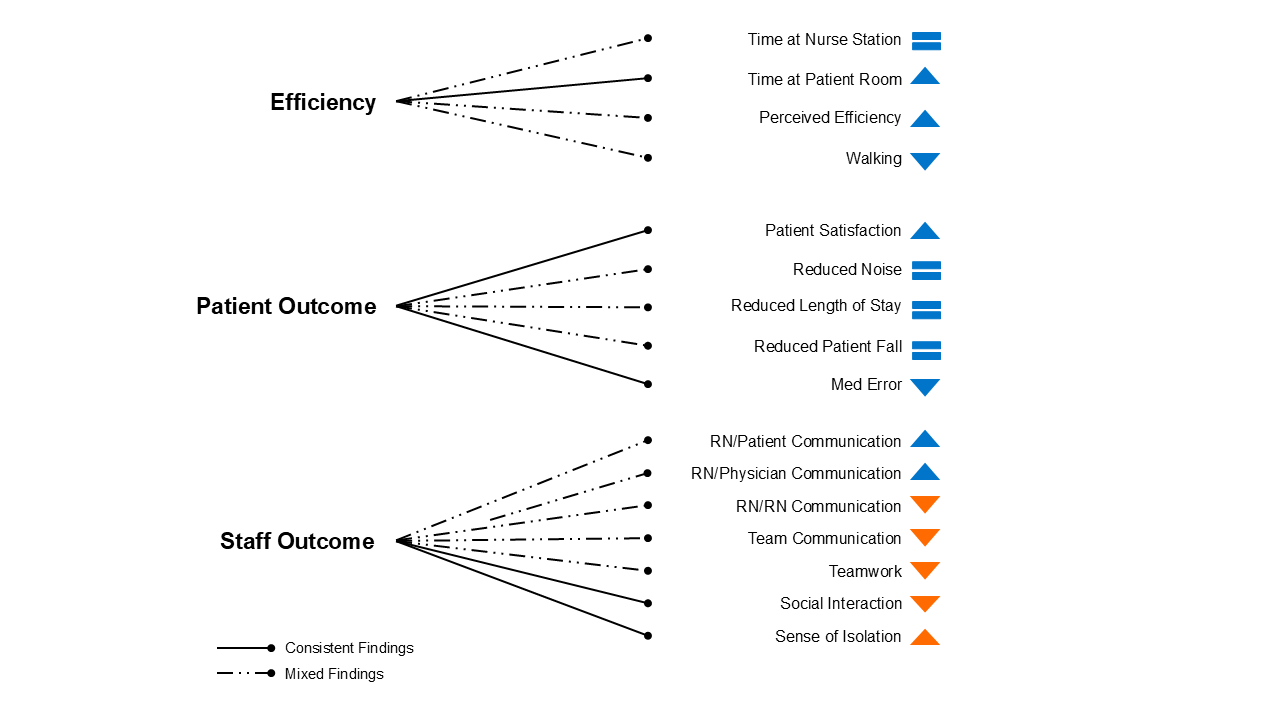 Across the literature, decentralized stations are consistently linked to more patient-centered care: stronger caregiver-to-patient communication, improved patient satisfaction, and reduced medication errors. However, the research also shows tradeoffs: social interaction and staff cohesion can weaken when caregivers are spread out, and findings on efficiency and walking distance are mixed, often driven less by the stations themselves and more by broader unit planning, staffing ratios, and the location of support spaces. In other words, successful decentralization depends on the full care delivery model and unit design, not a single workstation decision.