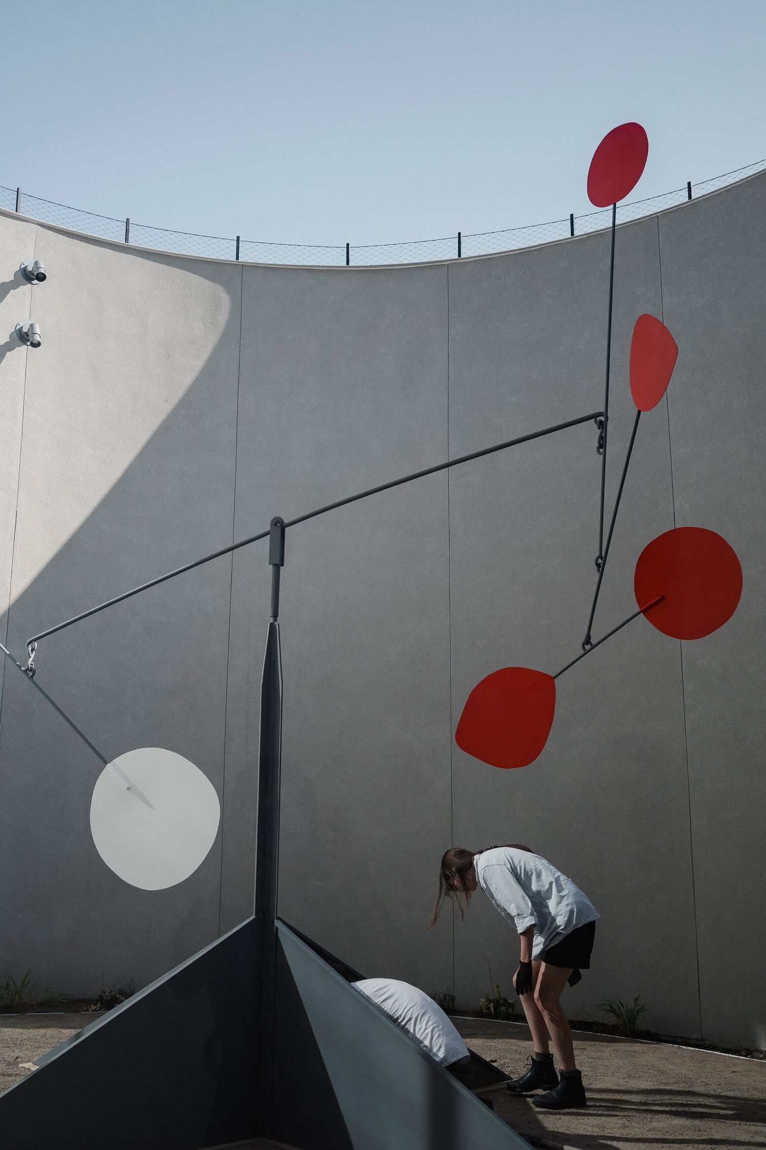 An untitled 1954 sculpture by Calder resides in a sunken garden. Lush plants will one day fill its walls.