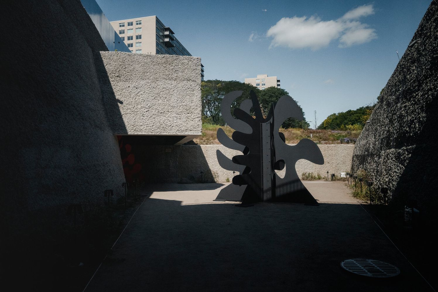Alexander Calder’s sculpture “Tripes,” from 1974, sits in the Vestige Garden. A sliver of his red “Knobs” (1976) is visible under the overhang to the left.